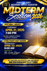 Join the Charleston County Missionary Baptist Association for its Midterm Session beginning Tuesday, April 21, 2026, at 7:00 PM with Host Night at New Cannon Street Missionary Baptist Church,